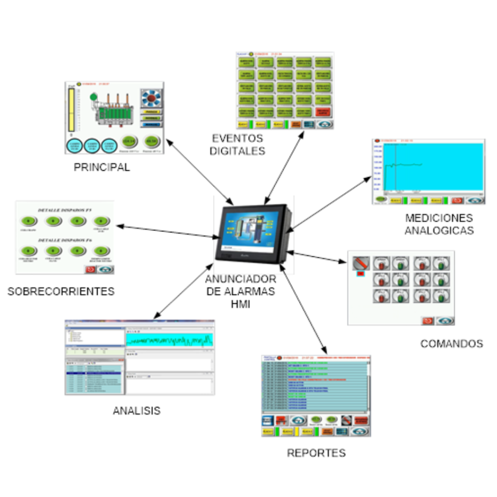 Sistema Electrónico Microprocesado: Diseñado para señalizar, comandar, alarmar y registrar eventos tanto digitales como analógicos. Este sistema integra toda la información crítica en una única unidad HMI, proporcionando un control completo y eficiente de su proceso.